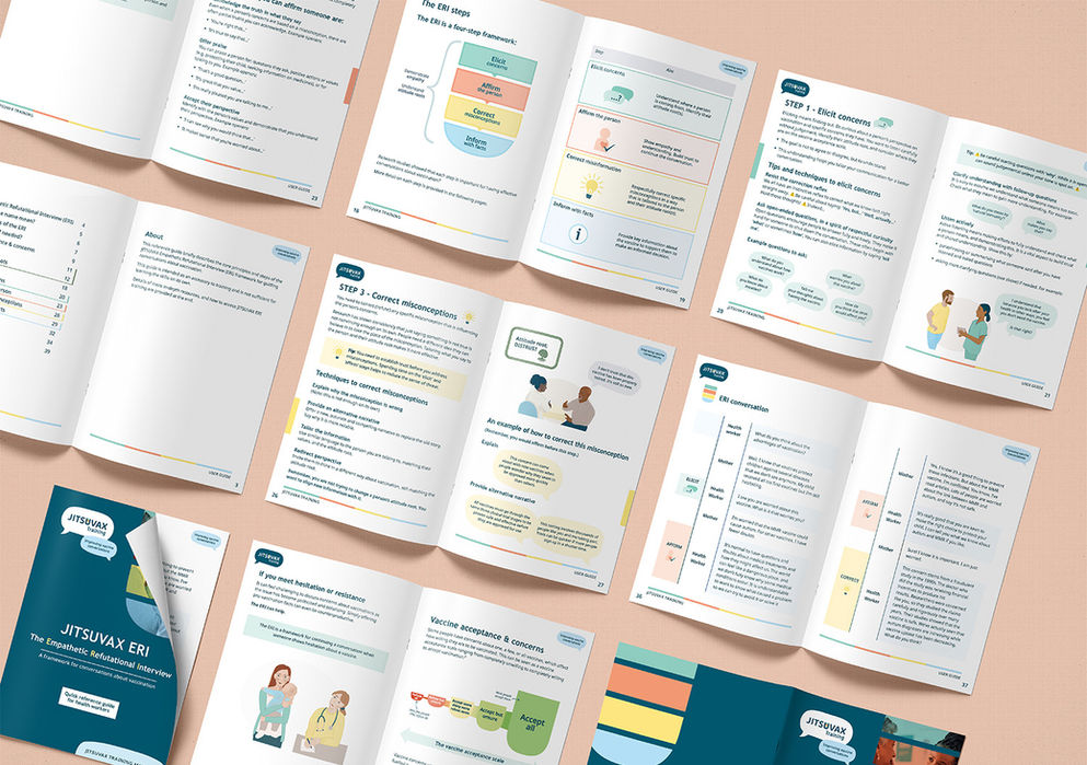 A social enterprise – JITSUVAX Training – was also born out of the project with the aim implementing the training developed by the project in a sustainable way. This also required a distinct brand identity and rebranded set of training and promotional materials.Developed the project's visual identity based on its existing logo and created a new set of corresponding diagrams. In careful consultation with the team, created a new set of illustrations to help explain key concepts, while avoiding inappropriate ('scary') imagery. Developed a new set of sympathetic character illustrations to accompany vaccine conversation dialogues. Designed a collection of training resources, including slides and handbooks.